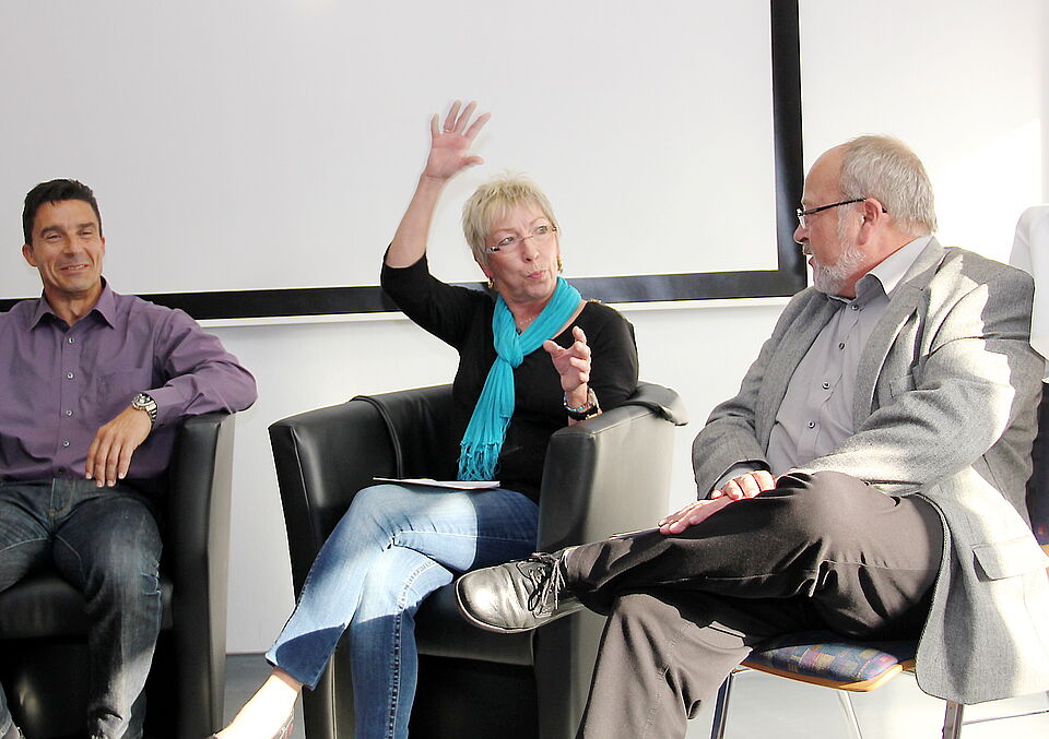 Nach Katz, Sirringhaus und Bierdel ließ Rotkreuz-Moderator Manfred Lang in einer zweiten Talkrunde Bernhard Rietfort vom Familienbildungswerk des Bistums Aachen in den Regionen Düren und Eifel, Ilona Raabe und Bodo Froebus von der Familienbildung des Roten Kreuzes sowie last but not least Trudi Baum, die Leiterin des Rotkreuz-Familienzentrums Schönau (Stadt Bad Münstereifel) ihre Erfahrungen mit Eltern und Kindern dem Auditorium vorstellen.