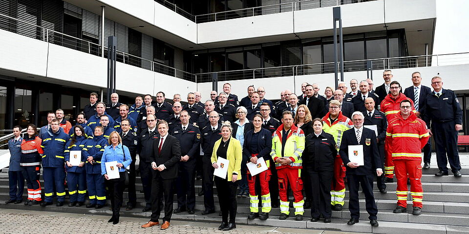 Insgesamt würden im gesamten Kreis Euskirchen rund 3.500 Medaillen samt Urkunden überreicht. Stellvertretend hätten Wehrleiter und Bürgermeister aller elf Kommunen die Medaillen für die Feuerwehren entgegengenommen, für die Einsatzkräfte der Organisationen waren Vertreter des Roten Kreuzes, des DLRG, der Malteser, des THW, der PSNV-E, des Rettungsdienst, der Leitstelle und des Führungsstabs anwesend.
