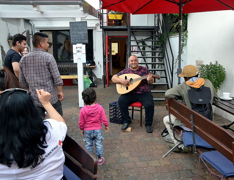 Fadi Alkhoury, ein Lautenspieler, musizierte für das begeisterte Publikum und entrollte im Hof gleichsam einen orientalisch-fröhlichen Klangteppich. Als besondere Überraschung trat ein gemischter Chor auf. Es gab strahlende Gesichter und regen Beifall.
