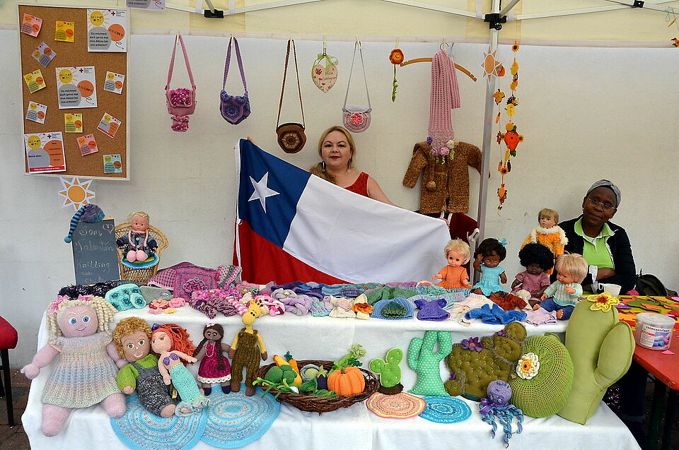Pamela Paul, Sängerin und Konzertgitarristin aus Chile, und ihr Mann Holger boten an ihrem Stand handgestrickte und -gebastelte Kleinigkeiten zum Verkauf an. Der Hof „Zick Zack“ hatte selbstgemachten Apfelsaft und Nüsse aus eigenem Anbau im Angebot.