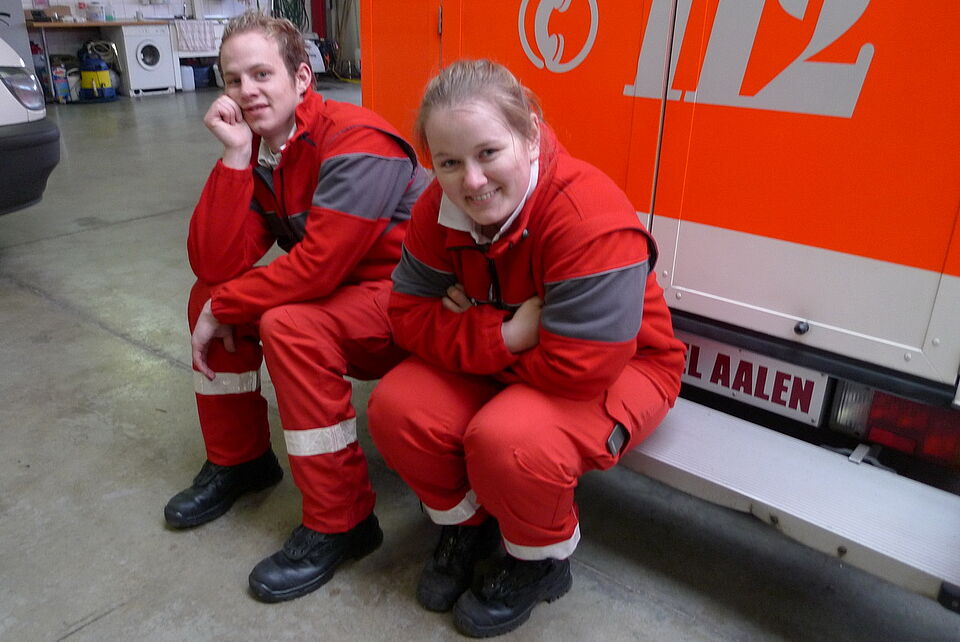 Bild DRK ZR | Lisbeth Friesen als Lehrretungsassistentin und Christian Wendler als Auszubildender im Rettungsdienst haben diesen Lehrgang schon lange hinter sich. Als Fachkräfte im Rettungsdienst warten sie auf ihren nächsten Einsatz im Rettungswagen.