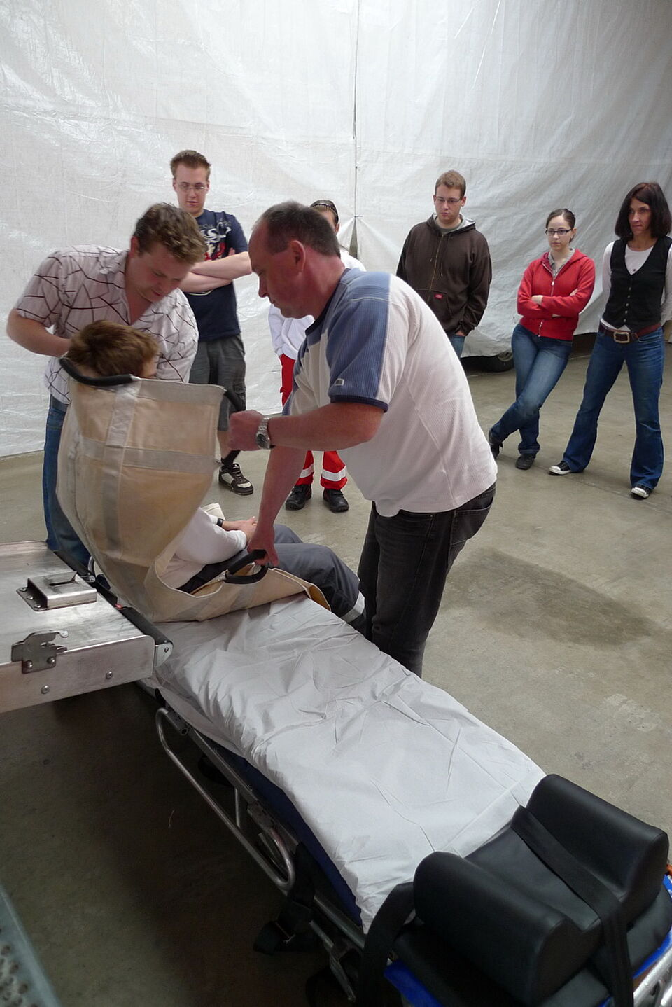 Bild DRK ZR | Lehrrettungsassistent Sebastian Schlüper demonstriert den richtigen Umgang mit der Fahrtrage.