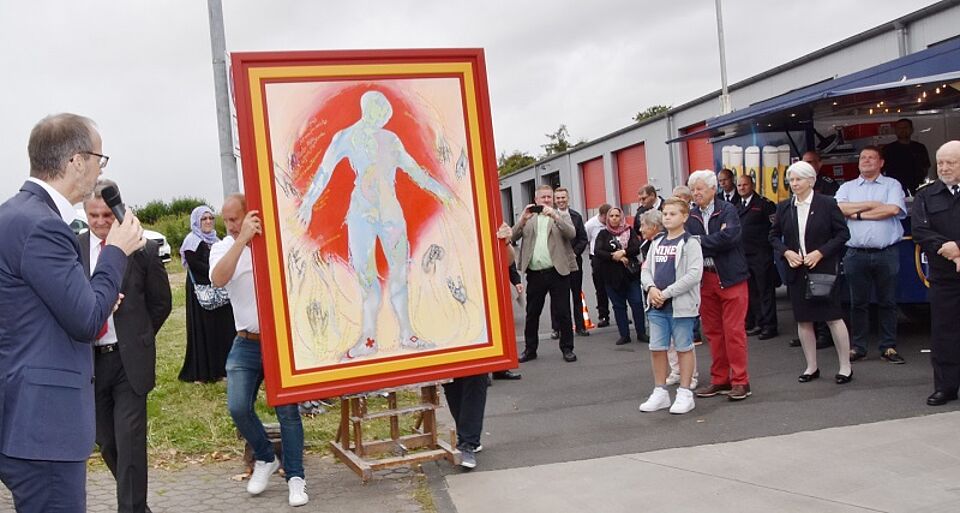 Udo Becker und Markus Ramers schenkten ein Kunstwerk ans Rote Kreuz zurück, das Maf Räderscheidt zusammen mit anderen Künstlerinnen beim Jahresausklang der Rotkreuz-Familienbildung 2017 geschaffen hatte und das seither in Räumlichkeiten der Kreissparkasse Euskirchen ausgestellt worden war. Außerdem hatten Becker und Ramers noch 5000 Euro für das DRK-Projekt „Keep cool“ gegen Gewalt im Alltag mitgebracht.