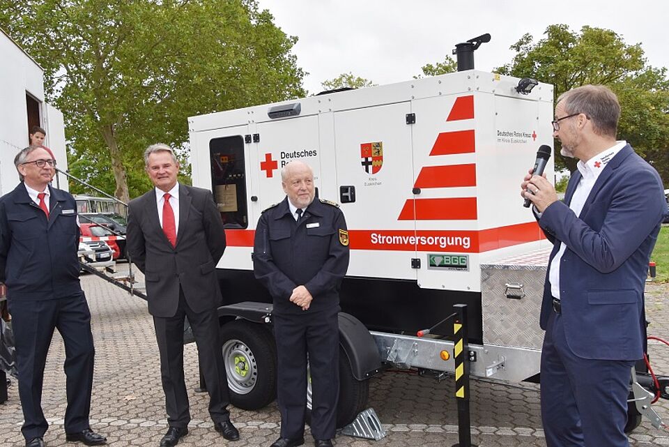 Landrat und Kreisbrandmeister überreichten ein wertvolles Notstromaggregat, das die Stromversorgung und damit die Einsatz- und Steuerungsbereitschaft im neuen Rotkreuz-Verwaltungstrakt auch im Krisenfall bei Dauerstromausfall gewährleisten soll. Udo Crespin sagte anerkennend zu Rolf Klöcker und Karl Werner Zimmermann: „Ohne das Rote Kreuz wäre der Katastrophenschutz im Kreis Euskirchen nur die Hälfte wert!“