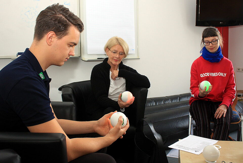 Eine andere Art der Entspannungsfähigkeit kann mit Qiu-Kugeln trainiert werden. Dabei geht um die Variabilität der Herzraten. Ole Müller von der BGF leitete die Rotkreuzler dazu in Atemtechniken an, um die Herzratenvariabilität zu verbessern. Die Qiu-Kugeln, die die Teilnehmer in den Händen hielten, zeigten dabei mit bunten Farben an, ob sich die Variabilität der Herzschläge gerade im roten oder grünen Bereich befand.