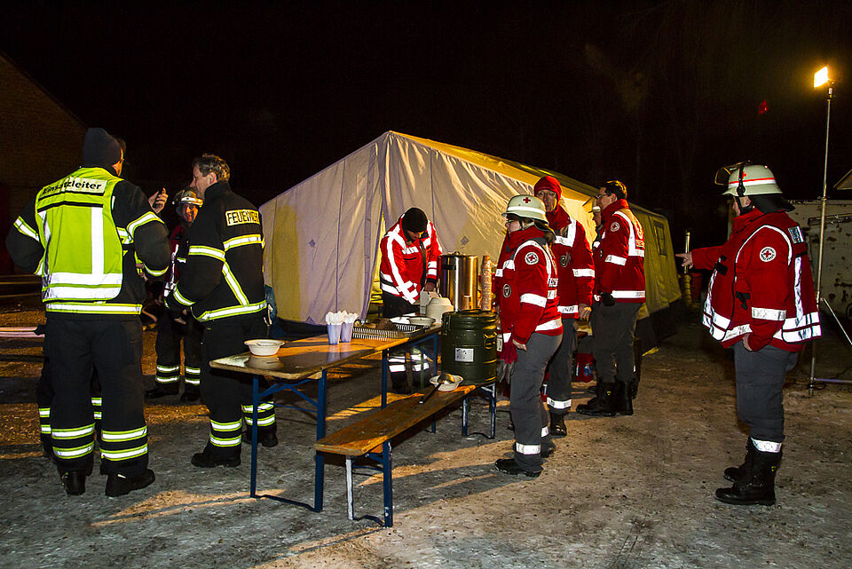 Aufgrund der kalten Witterung und des abzusehenden langen Einsatzes rückte das Rote Kreuz mit warmen Getränken, Suppe und einem beheizten Zelt nach Kessenich aus.