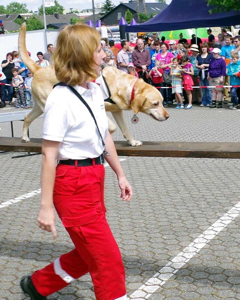 Besonders beliebt war wieder einmal die Vorführung der Rettungshundestaffel. Die Hunde und ihre ehrenamtlichen Hundeführer demonstrierten den Zuschauern, wie bei der Ausbildung gearbeitet wird. So liefen sie nicht nur über schmale Holzbohlen, sondern auch über Leitern und sprangen sogar einen Feuerreifen. Nach der Vorführung durften die Hunde von den Besuchern gestreichelt werden.