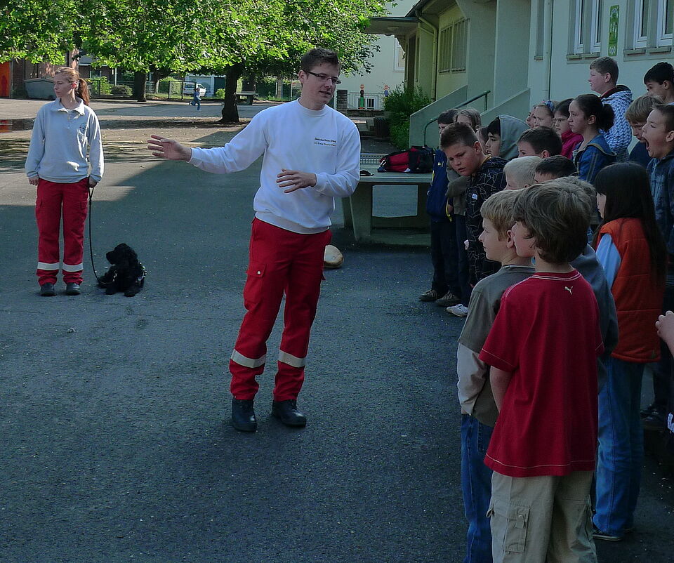 Die Kaller Rettungshundestaffel vermittelt den Schülern der 4c der Franziskusschule in Euskirchen die Arbeit der Suchhunde im Roten Kreuz.