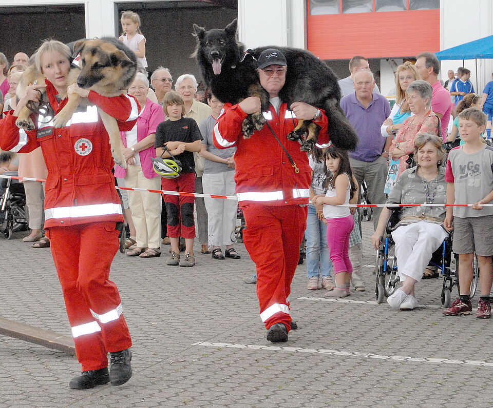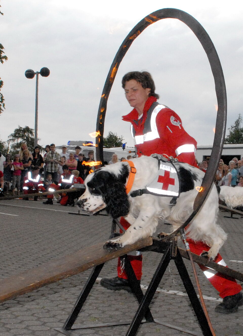 Nicht weniger Aufmerksamkeit wurde dem nachmittäglichen Auftritt der Rotkreuz-Rettungshundestaffel zuteil. Moderiert von Leiter Franz Küpper, zeigten die Mensch-Hund-Teams die Ergebnisse der intensiven wöchentlichen Ausbildung: Die vierbeinigen Retter balancierten über Leitern und Bretter, krochen durch eine Röhre und ließen sich - Omas Nerzkragen gleich - auf den Schultern ihrer Führer tragen. Zum krönenden Abschluss sprangen einige der Hunde sogar durch einen brennenden Reifen. Die beeindruckende Vorführung honorierten die begeisterten Zuschauer mit kräftigem Beifall, danach standen Zwei- und Vierbeiner für Fragen und Streicheleinheiten zur Verfügung.
