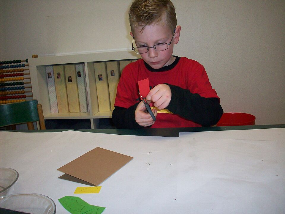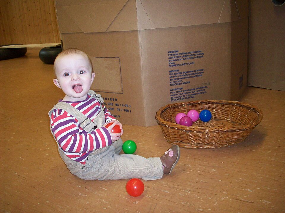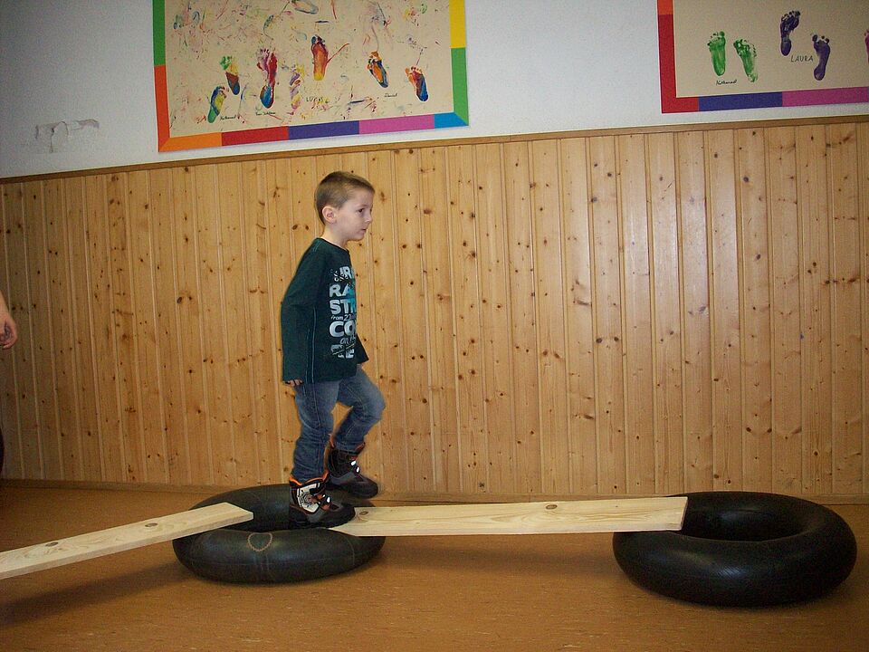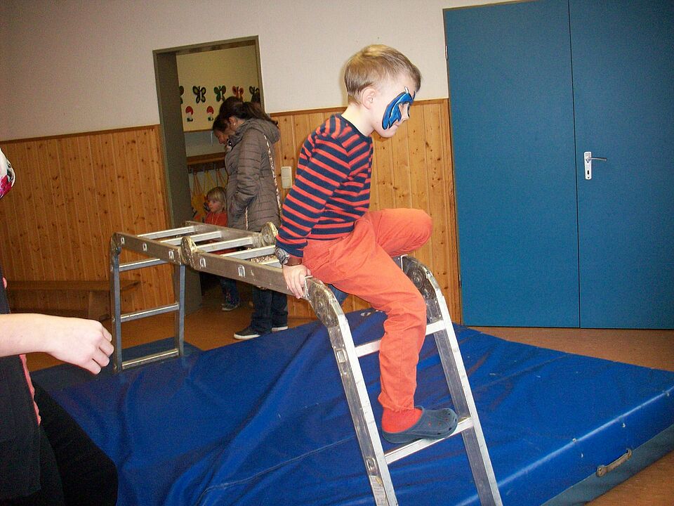 Um die Wahrnehmung der Sinne, sowie die Förderung der allgemeinen Motorik, ging es im Bewegungsraum. Aus alltäglichen Gegenständen wie Getränkekästen, aufklappbaren Maßstäben, Pappkartons und -röhren, Holzbrettern und Leitern war ein Parkour aufgebaut, der die Kinder zum Klettern und physiomotorischen Übungen einlud.