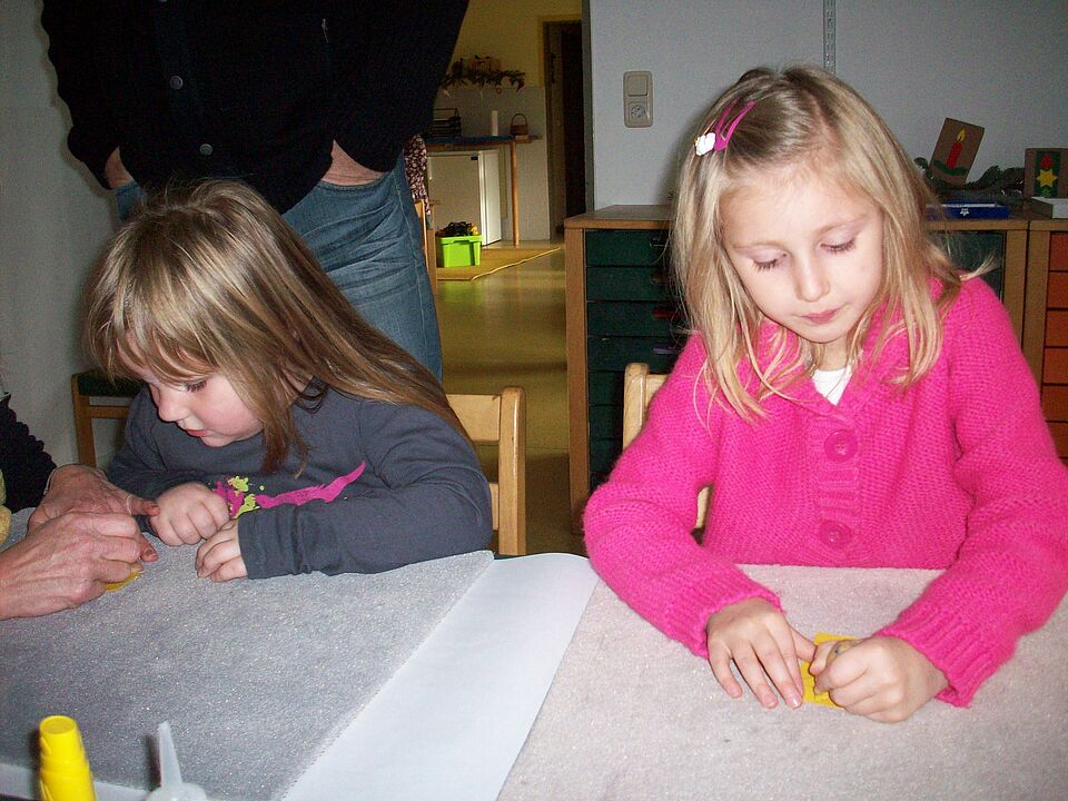 Mit viel Eifer wurde der Baumschmuck, den die Kinder in den vergangen Tagen gebastelt hatten, an den Baum gehangen. Kleine Zapfentörtchen, Weihnachtstütchen mit Nikoläusen und Elchen, Lebkuchenmänner und Mandarinenkränzchen ließen den Baum im weihnachtlichen Glanz erscheinen.