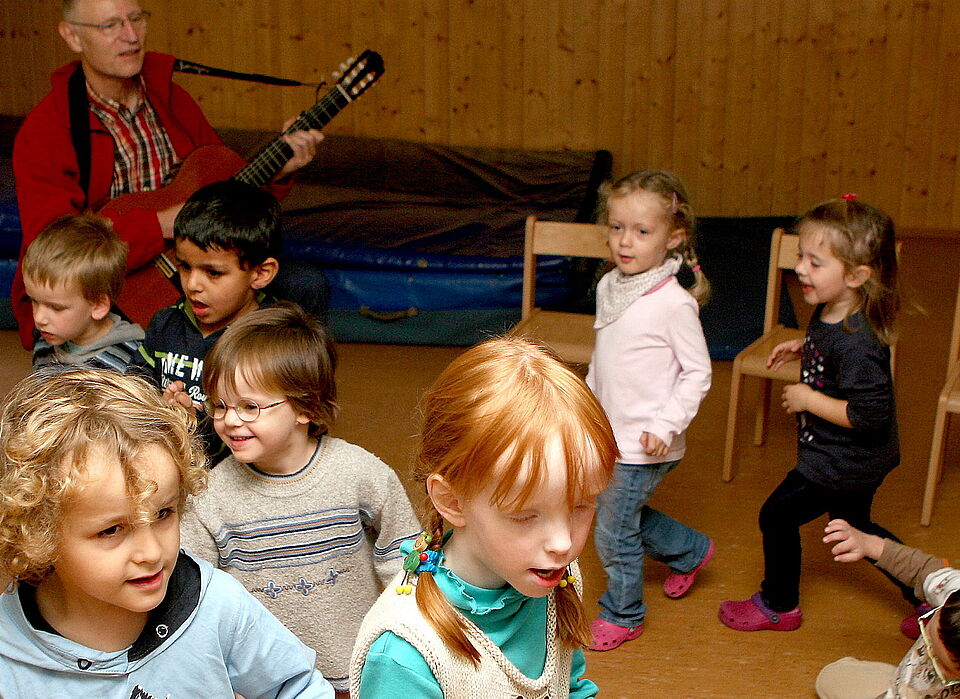 Auch wenn ihre Gangart eher Trab als Galopp gleicht, so sind die Rotkreuz-Kindergartenkinder doch augenscheinlich mit viel Spaß bei der Sache. Einmal in der Woche singen und bewegen sie sich unter Animation der Grundschullehrerin Charlotte Roux-Bücker und ihres Mannes Wolfgang Bücker, der dazu Gitarre spielt.