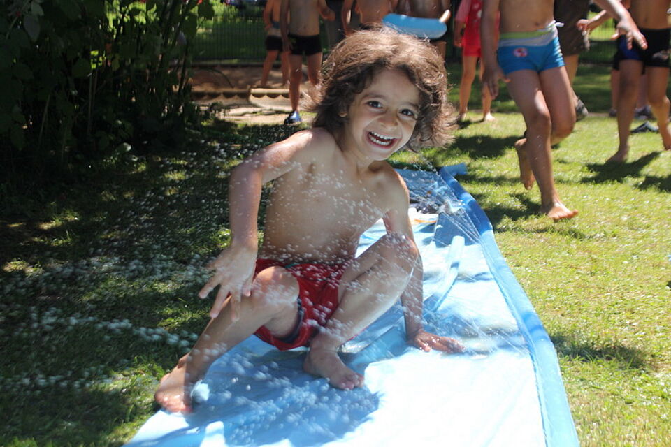 Nun heißt es: „Wasser marsch!“ Und das kühle Nass saust durch den gift-grünen und ewig langen Schlauch an die richtigen Stellen im neuen Matsch-Areal. Mit „Yippie!“-Rufen stürmen die Kinder in Badekleidung los. Zu Ehren des Tages sind auch Planschbecken und eine Wasser-Rutsche aufgebaut. Die Kinder haben viel Spaß.