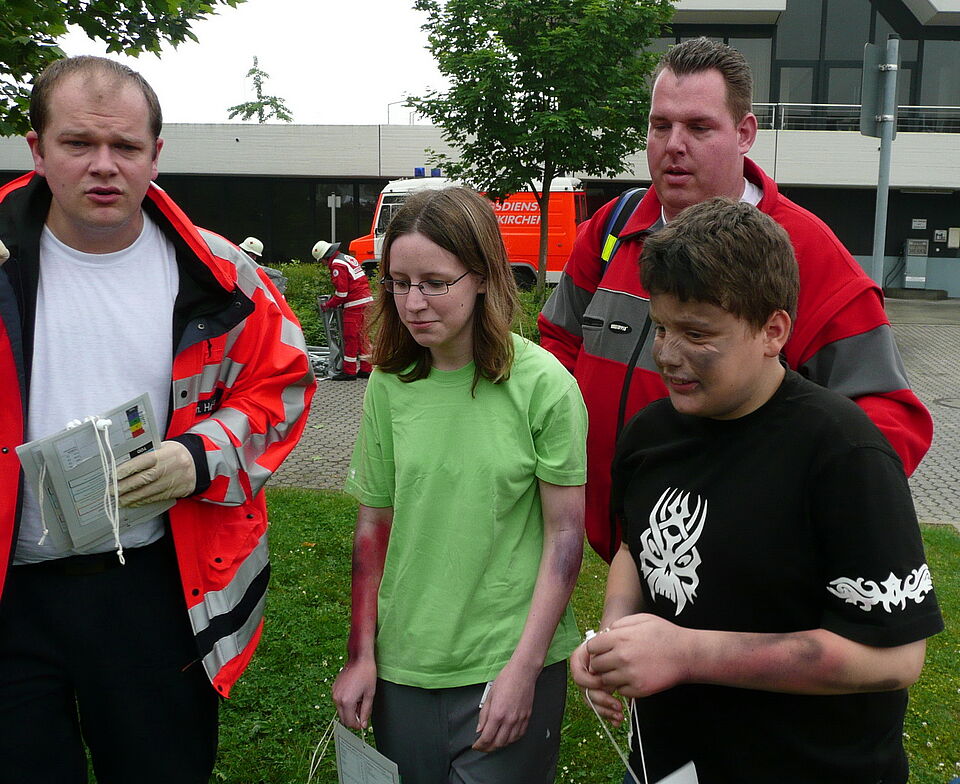 Die bei der Übung eingesetzten Kräfte für die Rettung der Betroffenen aus dem einsturzgefährdeten Gebäude (Feuerwehr und THW), für zwei Patientenablagen (Rotes Kreuz und Malteser) und für den Behandlungsplatz (Rotes Kreuz , Feuerwehr Pesch und MHD) hatten keine Zeit für lange Diskussionen.