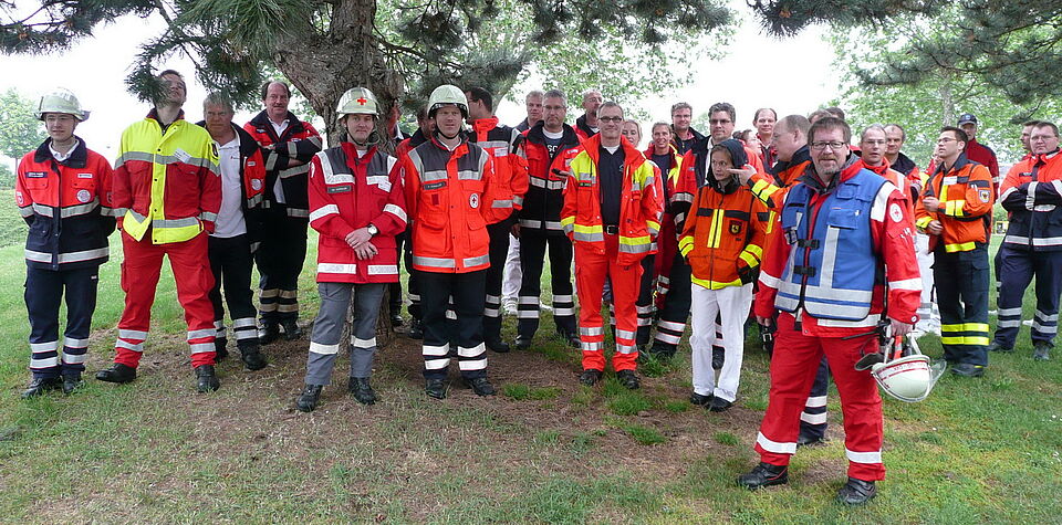 Bild DRK ZR | 36 Teilnehmer eines Lehrgangs zum leitenden Notarzt oder oranisatorischen Leiter Rettungsdienst aus der ganzen Bundesrepublik beobachten das Übungsgeschehen.