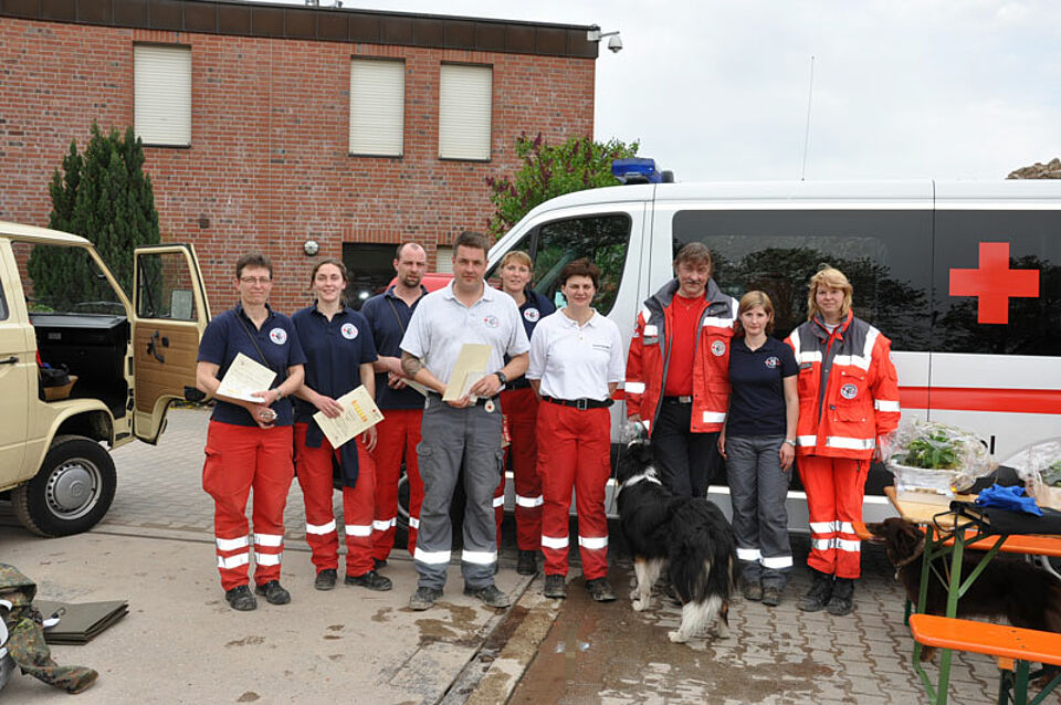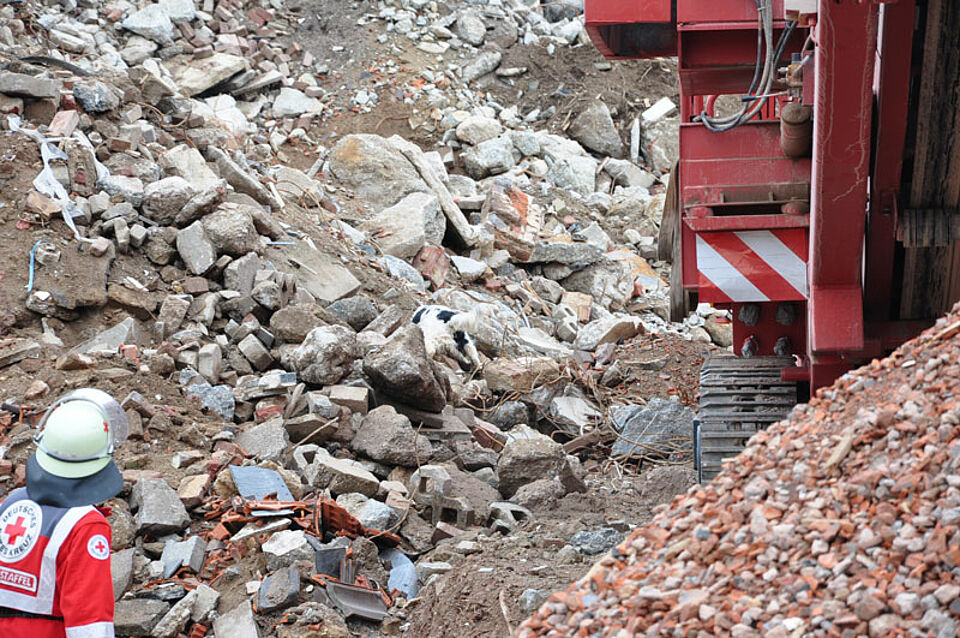 Anschließend fand für Rettungshund „Tristan“ die Gehorsamsübung statt, ehe es nach der Geräteprüfung auf dem Gelände eines Abbruchunternehmens auf die Suche nach mehreren Verschütteten ging. Die beiden Rettungshundeprüfer Michael Kielau und Almuth Schaefer bescheinigten dem Rotkreuz-Team aus Kall eine durchweg gute Leistung.