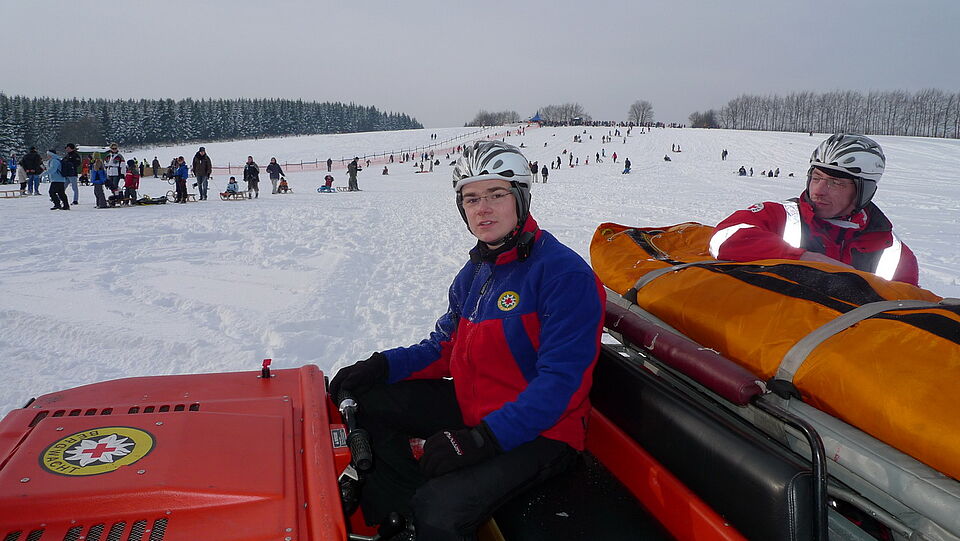 Die Bergwachtler des Roten Kreuzes waren für den Fall der Fälle gut gerüstet und mit ihrem Argo, einem geländegängigen Fahrzeug, direkt zur Stelle, um im Ernstfall verunglückte Skifahrer oder Rodler schnell aus dem Hang zu retten und an die Kollegen des Rettungsdienstes zu übergeben.