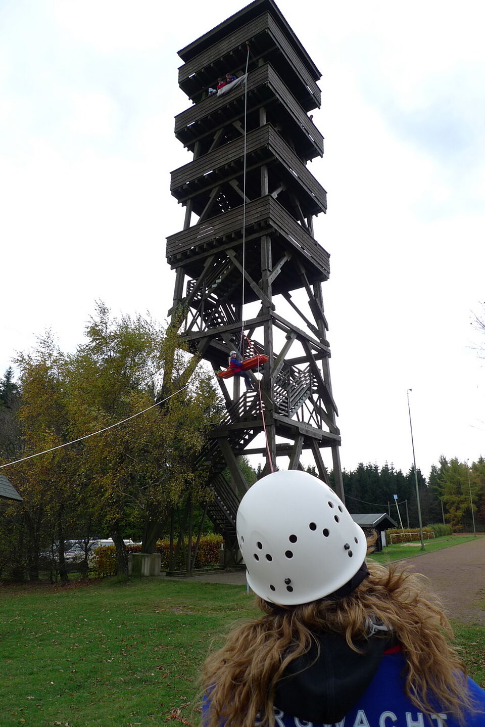 Bild DRK ZR | Auf der obersten Plattform des Udenbrether Turms bereiten die Rotkreuz-Bergwachtler die Rettung eines Verunfallten vor.