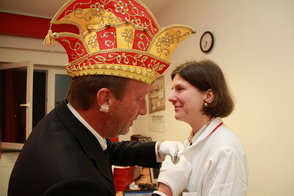 Natürlich musste auch die Tollität zunächst einmal ihre Blutgruppe bestimmen lassen und zu einem Arztgespräch antreten. Doch bevor Dr. Annegret Butke, die extra aus Bonn angereist war, die närrische Hoheit vertrauensvoll befragen konnte, wurde ihr vom Prinzen der Sessionsbutton angeheftet.