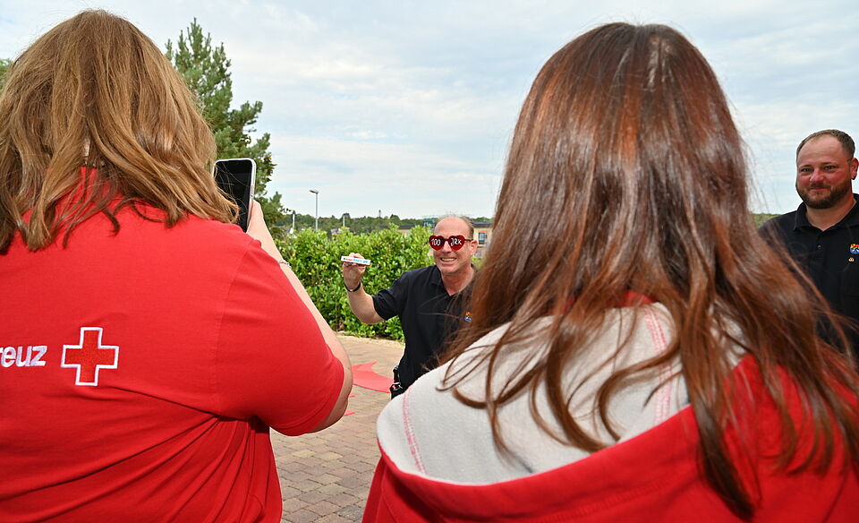 Zu den frühesten Gästen im Rotkreuzzentrum Mechernich zählte die Jugendfeuerwehr Mechernich, angeführt von Jugendfeuerwehrwart Heiko Söhnchen und dem stellvertretenden Wehrleiter Markus Kurtensiefen. 13 der insgesamt 27 Nachwuchslöschkräfte schauten vorbei – und setzten, wie viele andere, eine rosa-rote Herzchenbrille auf, um sich von Kerstin Dombrowski (JRK Kall) sowie Anika Lang (JRK Kall) für ein Video, das nach dem Aktionstag geschnitten werden soll, interviewen und filmen zu lassen.