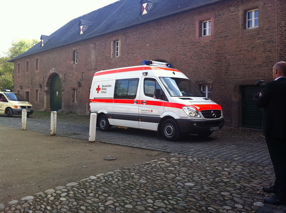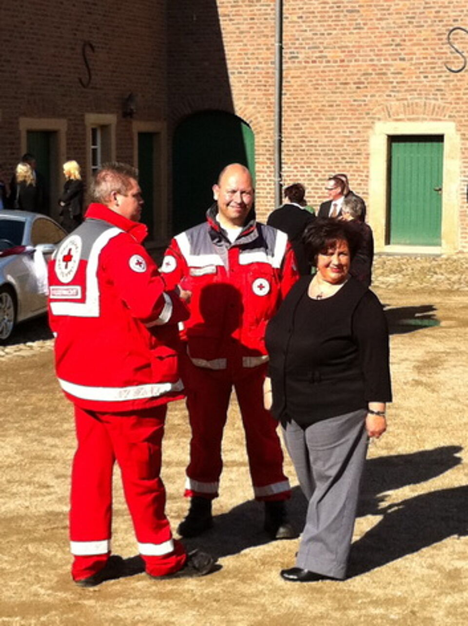 Als das frisch vermählte Paar aus dem Schloss kam, wurde es von einem Blaulichtgewitter und Martinshörnern stilvoll in Empfang genommen. Trotz der Großübung am Kreishaus, fuhr der Ortsverein Kall mit der Einsatzeinheit, einer Abordnung der Wasserwacht, Hundestaffel und des Jugendrotkreuzes nach Niederau.