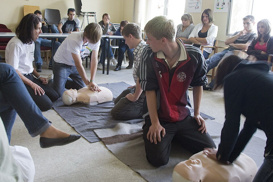 Bild DRK ET | Die Herz-Lungen-Wiederbelebung wird in kleinen Gruppen trainiert.
