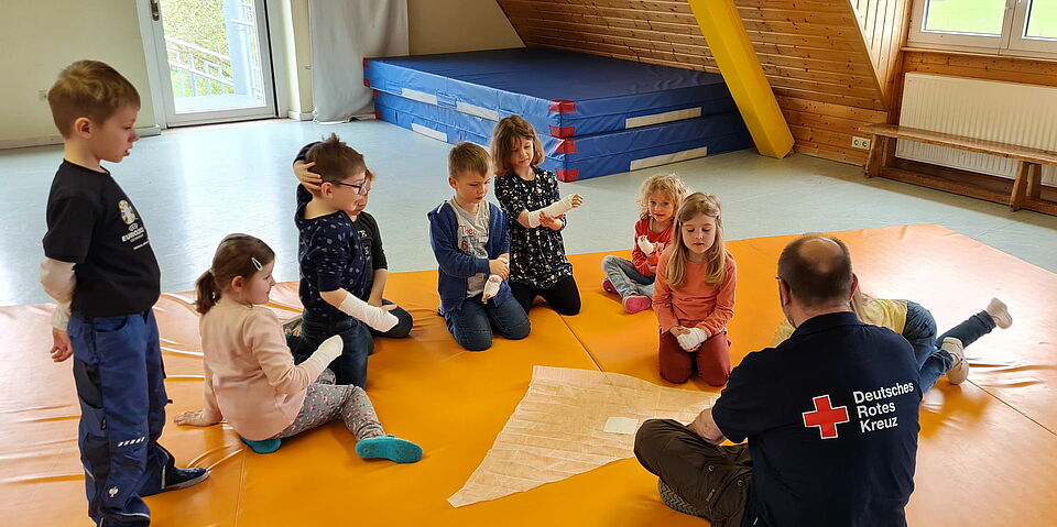 Unter dem Motto „Keiner ist zu klein, um Helfer zu sein" lernten die Kinder, wie sie in Notfallsituationen helfen können. Rolf und sein flauschiger Begleiter erklärten den Kindern, was Erste Hilfe ist und was zu tun ist, wenn sich jemand verletzt. Dabei wurde den Kindern nahegebracht, dass man zuerst den Verletzten tröstet, Hilfe holt oder laut ruft.