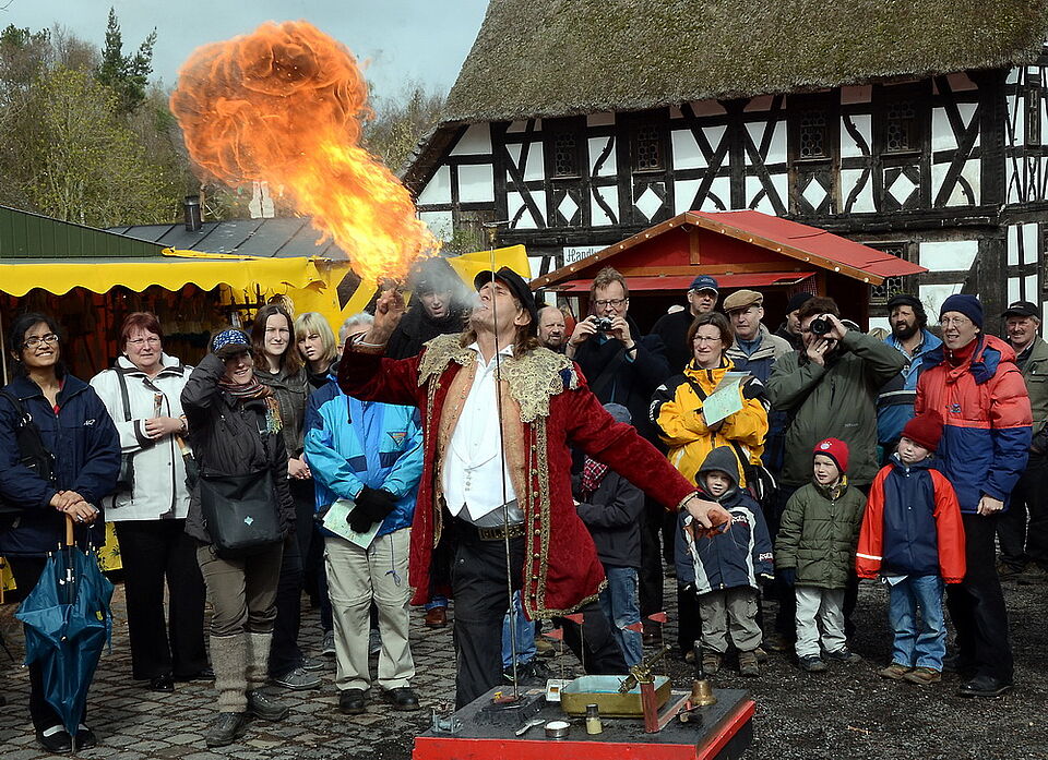 Dr. Michael H. Faber, der Jahrmarktmacher und stellvertretende Direktor des LVR-Freilichtmuseums Kommern, war einmal mehr auch selbst unter dem fahrenden Volk als Akteur auszumachen, beispielsweise bei spektakulären Hinrichtungen an einer zugegebenermaßen manipulierten Guillotine, so dass auch in diesem Jahr niemand ernsthaft zu Schaden kommt.