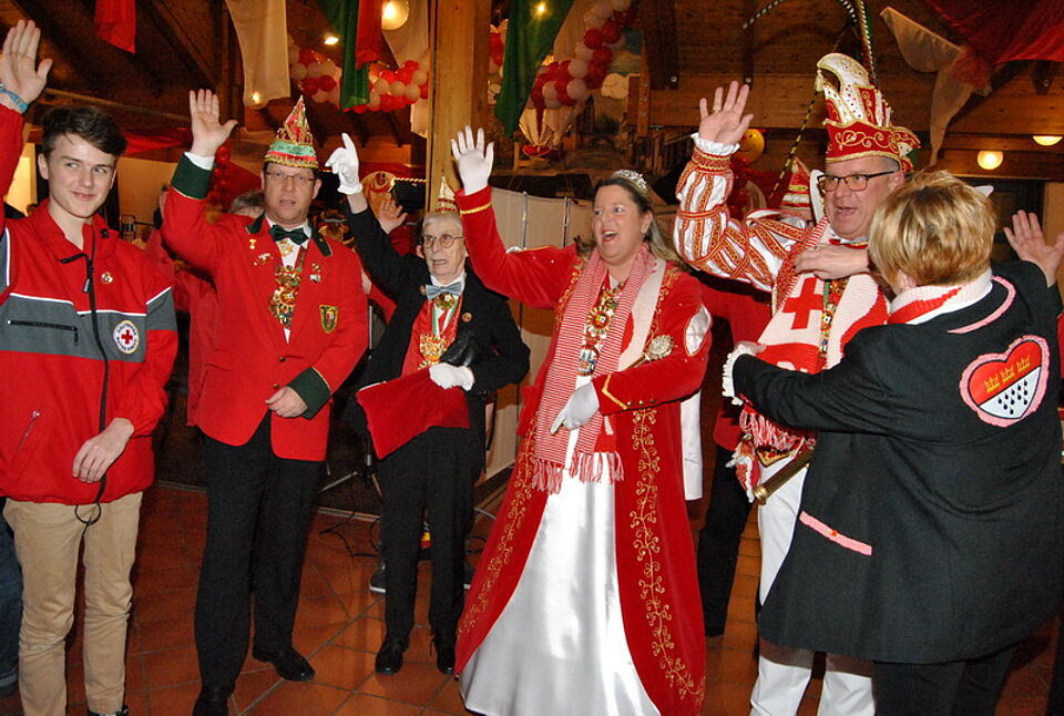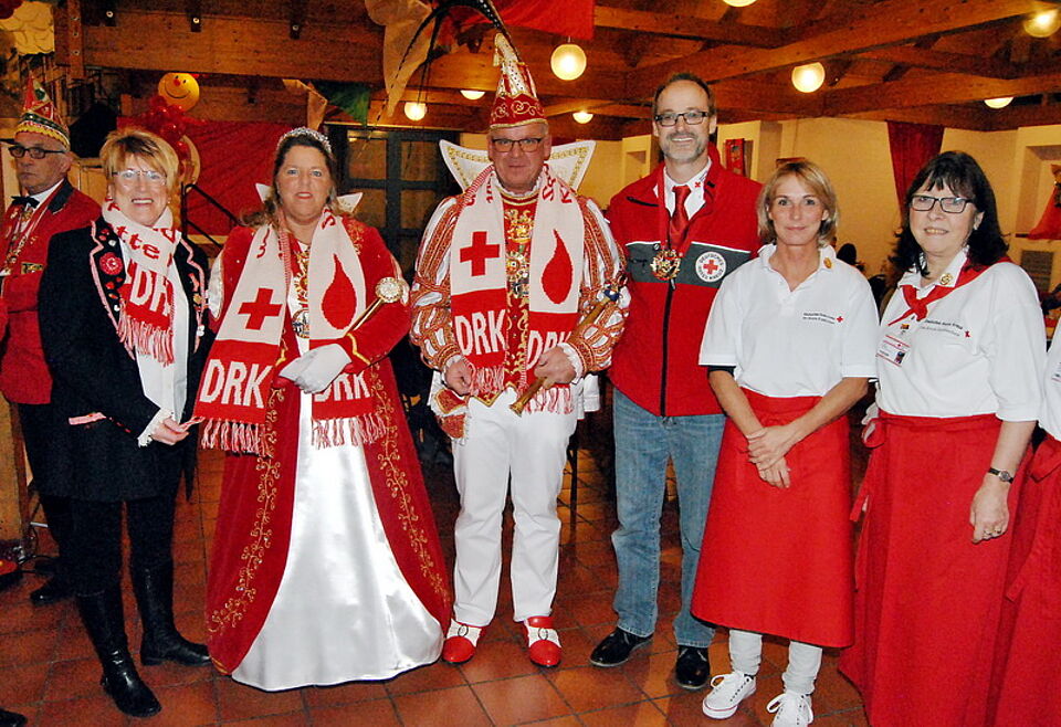 Während Prinz Guido I. aus gesundheitlichen Gründen nicht spenden durfte, gingen Prinzessin Sabine II. und Mitglieder der KG Greesberger mit gutem Beispiel voran. Als kleines Dankeschön überreichten Rolf Klöcker und Blutspendebeauftragte Edeltraud Engelen warme Winterschals des DRK, die farblich perfekt zum Tollitäten-Ornat passten. Aber auch das Prinzenpaar ließ sich nicht lumpen und dekorierte die Helfer des DRK-Ortsvereins und des Jugendrotkreuzes mit Ansteckern und Orden.