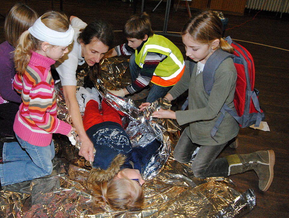 „Und das Trösten“, ergänzt Gabi Kabatnik, denn die Kinder lernen auch, im Ernstfall ihren Mitschülern, die Schmerzen oder Angst haben, seelischen Beistand zu leisten. Gelegenheit dazu hatten sie gleich am ersten Tag: Kaum, dass die große Pause begonnen hatte, konnten die jungen Ersthelfer ihr neuerworbenes Wissen anwenden und den eingeklemmten Finger eines Mitschülers behandeln. Das Trösten übernahm in diesem Fall Schulleiter Willy Gemünd selbst. „Wer zuerst lacht, hat verloren“, forderte er heraus – mit Erfolg.