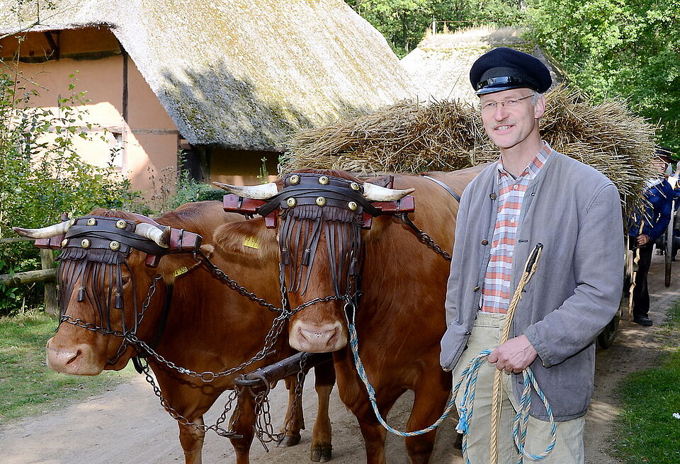 Ein Publikumsmagnet waren nicht nur der Gespannkorso an den Vormittagen der „Tag nach der Ernte“ und die Züge der Oldtimer-Traktoren am Nachmittag, sondern vor allem die Vorführungen tagsüber in der Baugruppe Niederrhein. Da waren Ochsen, Kühe, Esel und Kaltblutpferde bei der Arbeit zu bewundern - und zwar in den unterschiedlichsten Anspannungen, wie sie früher in Gebrauch waren.