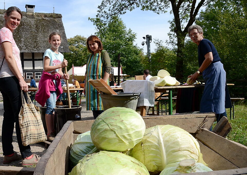 „Wir haben in diesem Jahr ein besonderes Augenmerk auf die Arbeit mit Pferde- und Ochsengespannen gelegt“, sagte Landesmuseumsdirektor Michael H. Faber Medienvertretern. Gleichwohl standen auch Obstdörre, Saftpresse, Flachsbreche und Sauerkraut-Schabe und „Kappesstampfer“ nicht still. Denn: Die Frauen hatten früher nach der Ernte ganz besonders ihren „Mann“ zu stehen. „Nach der Ernte“ ist eine der erfolgreichsten Großveranstaltungen des Kommerner Freilichtmuseums – und hat sich am Wochenende auch in Konkurrenz zu einer ganzen Reihe anderer Events im nahen Umland publikumsmäßig bewährt.