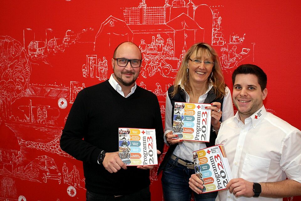 Im Rotkreuz-Zentrum Euskirchen präsentieren Patrick Dost, (Bereichsleitung Aus- und Weiterbildung), Heike Iven (Leiterin Familienbildung) und Daniel Larres (Leiter Bildungsakademie) das frisch gedruckte Jahresprogramm. Auf rund 150 Seiten finden sich alle Informationen rund um die Kursangebote des Roten Kreuzes im Kreis Euskirchen.