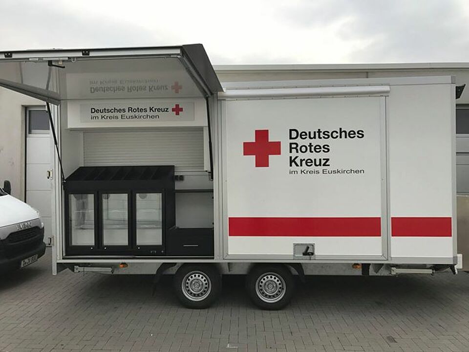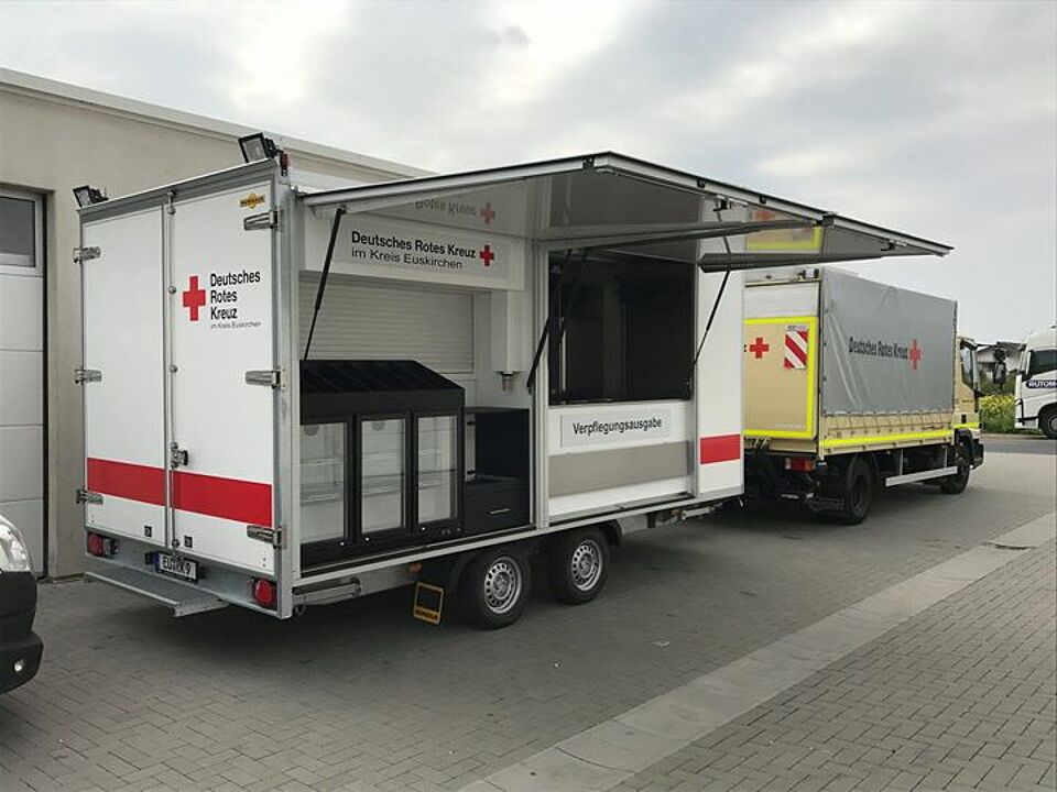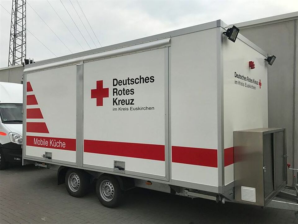 Das neue Fahrzeug auf Basis eines Anhängers erfüllt alle Anforderungen an eine moderne Großküche und ist vollständig autark und fast überall einsetzbar. Ausgestattet mit modernster Küchentechnik auf Propangas-Basis, können die Verpflegungsspezialisten auf ein hochmodernes Einsatzmittel zurückgreifen. Zusammen mit den stationären Einsatzküchen und einem umfangreichen Netzwerk an Partnerunternehmen, die eine 24h Nachschubversorgung garantieren, ist das Rote Kreuz im Kreis Euskirchen als Spezialist für Einsatzkräfteversorgung bestens aufgestellt.