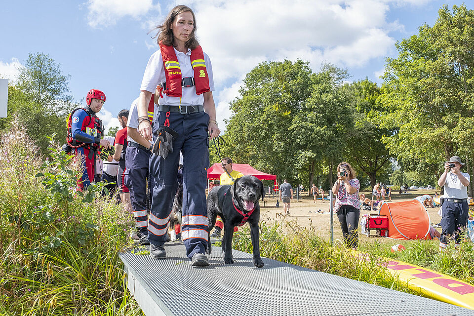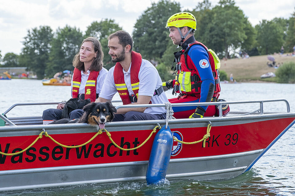 So wie sich die Hunde an die Boote gewöhnen sollten, so konnten die Wasserretter gleichzeitig den Umgang mit den Tieren üben. Schließlich werden bei ihren Einsätzen nicht selten nur die Menschen gerettet, sondern auch deren Haustiere.