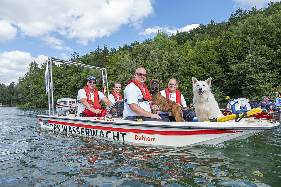 Kurz danach geht es schon wieder zurück ans Land. Dort sind in der Zwischenzeit Ausbildungsleiterin Monika Artz und Hendrik Dahmen, der stellvertretende Leiter der DRK-Rettungshundeeinheit, mit acht weiteren Einsatzkräften und neun Hunden angekommen. „Wir haben ganz junge Hunde dabei, aber auch erfahrene Tiere“, erläutert Hendrik Dahmen. Alle Tiere und ihre Hundeführer sollen sich zunächst an die Boote gewöhnen. Jeweils zwei Hunde können pro Boot mitfahren. Beim Einsteigen verhalten sich die Tiere ganz unterschiedlich – die einen mutig und forsch, die anderen etwas zurückhaltend. Aber als es dann los geht, genießen sie die Tour mit den Booten und lassen sich den Fahrtwind um die Schnauzen wehen.