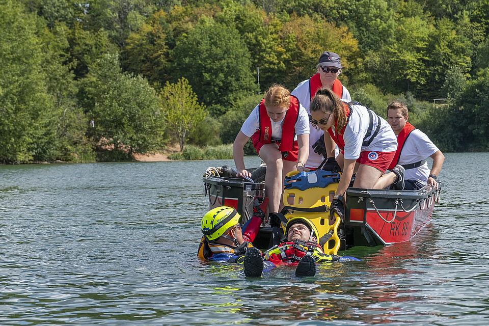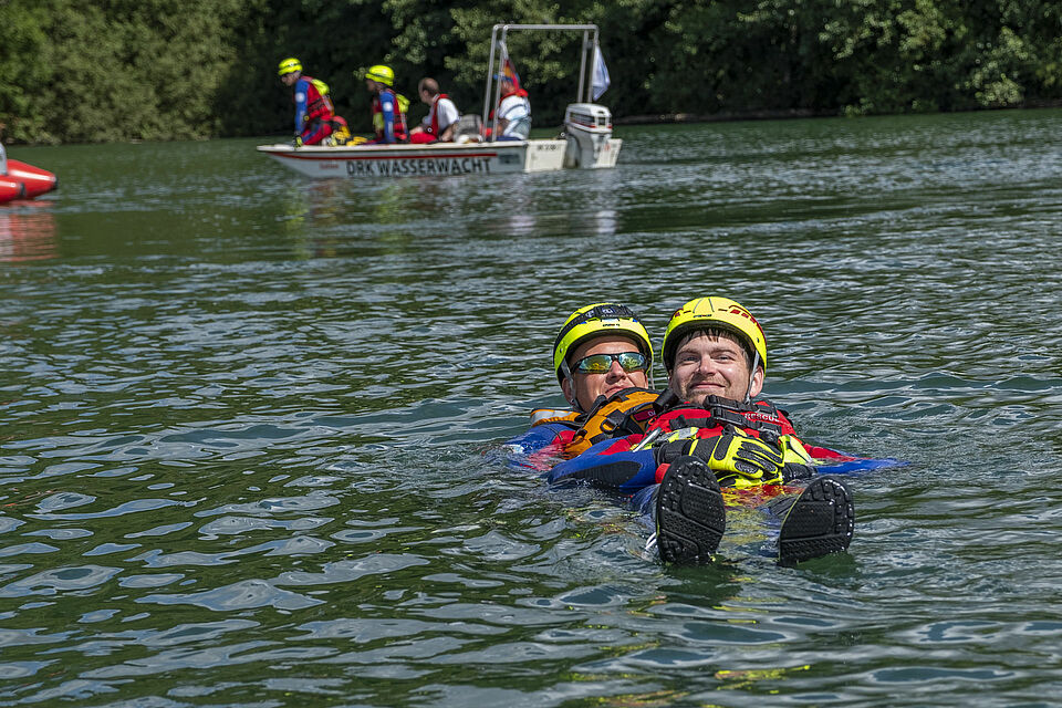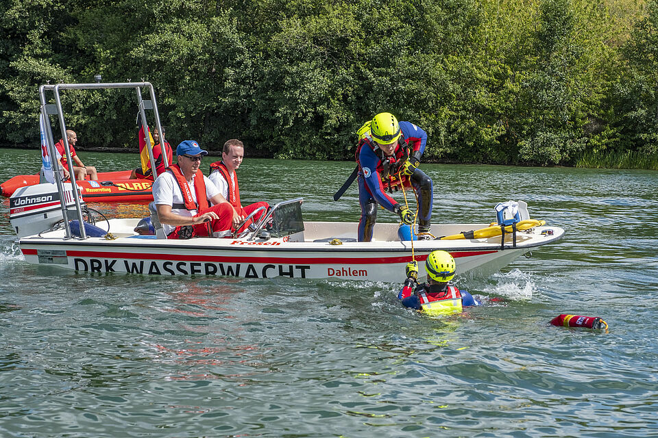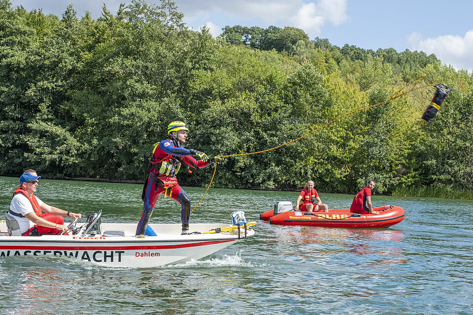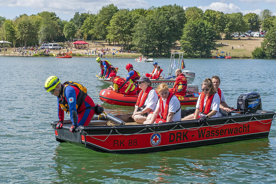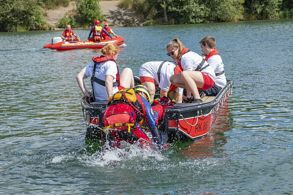 Plötzlich und von den anderen unbemerkt schickt Sylvia Napiletzki von der Bonner Wasserwacht ihren Fließwasserretter Alexander Zuber ins Wasser. Ein unerwartetes Mann-über-Bord-Manöver. Die Kaller Retter im benachbarten Boot reagieren zügig und gekonnt. Auch dort ist ein Fließwasserretter an Bord. Mit Neopren-Anzug und etlichen Ausrüstungsgegenständen ausgestattet, sind diese Einsatzkräfte eigentlich dafür da, Menschen aus Strömungen zu retten – in ruhigen Gewässern wie dem Freilinger See klappt das natürlich auch. Zudem freut sich der Retter in Neopren bei den heißen Temperaturen über eine Abkühlung. Er springt ins Wasser und zieht Alexander Zuber zum Boot der Kaller Besatzung.