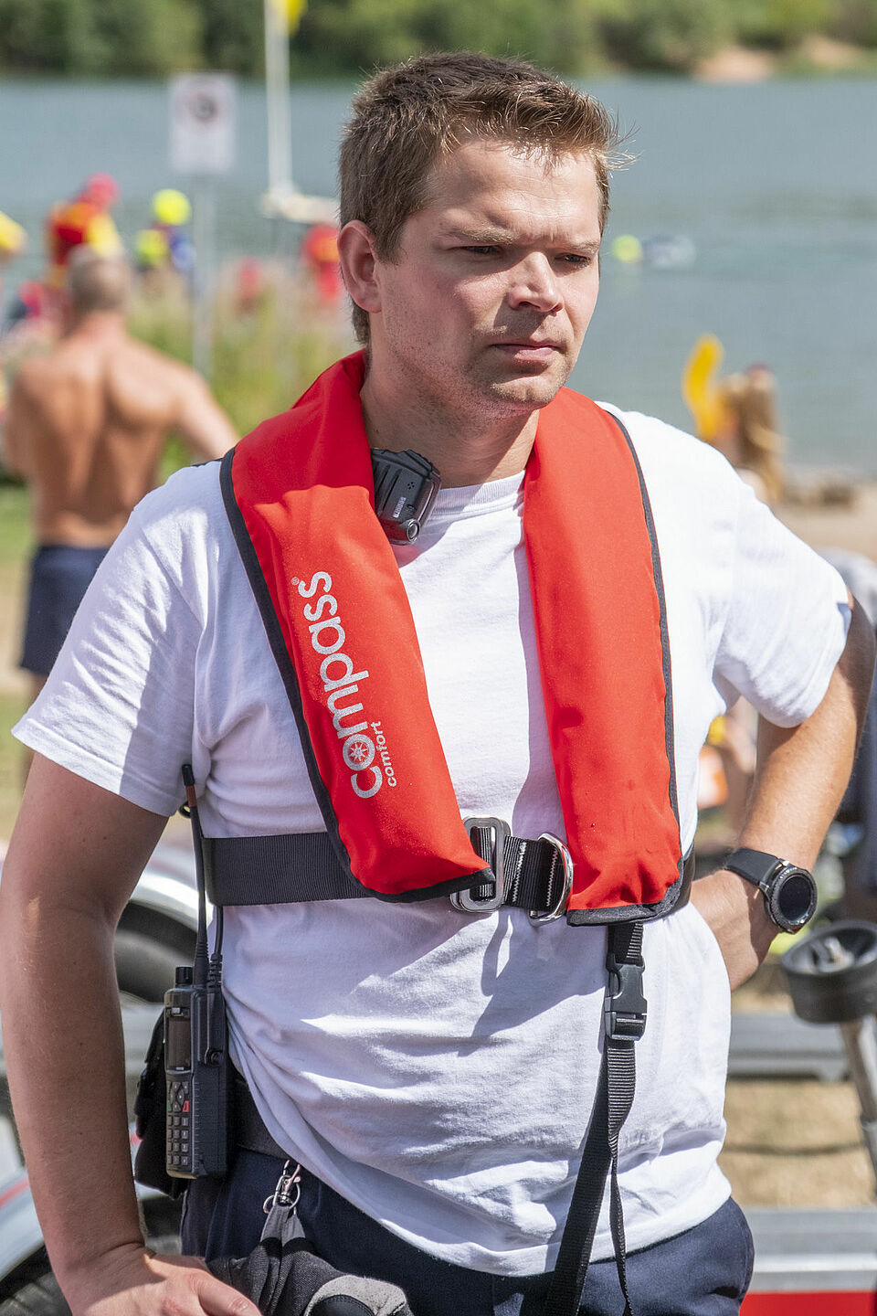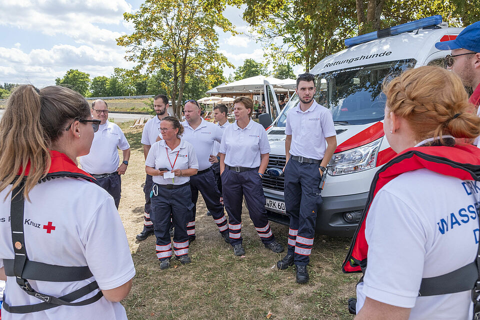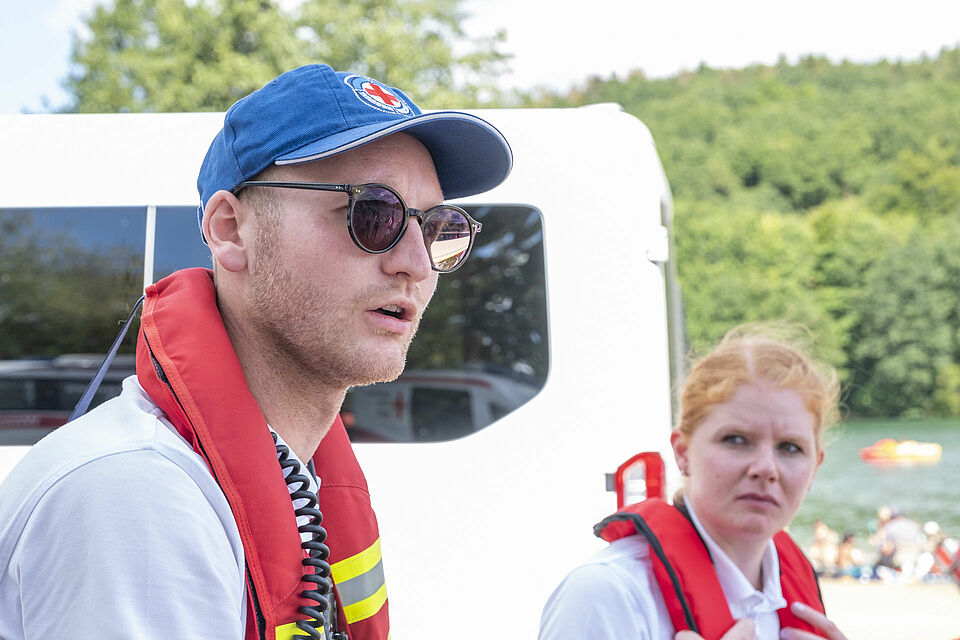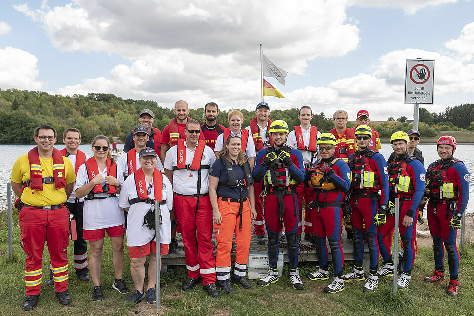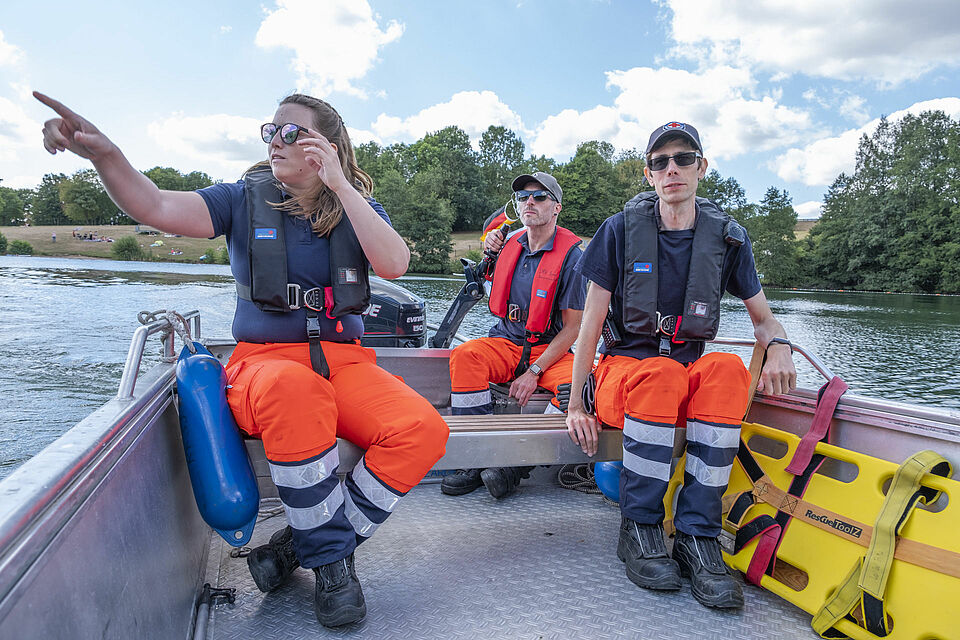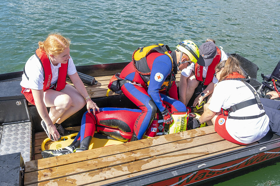 Plötzlich und von den anderen unbemerkt schickt Sylvia Napiletzki von der Bonner Wasserwacht ihren Fließwasserretter Alexander Zuber ins Wasser. Ein unerwartetes Mann-über-Bord-Manöver. Die Kaller Retter im benachbarten Boot reagieren zügig und gekonnt. Auch dort ist ein Fließwasserretter an Bord. Mit Neopren-Anzug und etlichen Ausrüstungsgegenständen ausgestattet, sind diese Einsatzkräfte eigentlich dafür da, Menschen aus Strömungen zu retten – in ruhigen Gewässern wie dem Freilinger See klappt das natürlich auch. Zudem freut sich der Retter in Neopren bei den heißen Temperaturen über eine Abkühlung. Er springt ins Wasser und zieht Alexander Zuber zum Boot der Kaller Besatzung.
