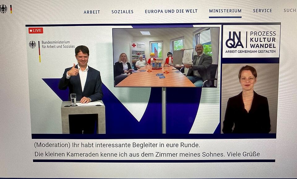 Vereinfacht geht es um die Zufriedenheit der Beschäftigten mit ihrem Arbeitsplatz – und um die ist es beim Roten Kreuz offensichtlich gut bestellt. Überreicht wurde die mit dieser Feststellung verbundene INQA-Audit-Plakette während einer Online-Feierstunde. Von Berlin aus wurden in einer moderierten Sendung insgesamt 40 Unternehmen in der ganzen Republik erneut mit INQA-Qualitätssiegel ausgestattet. Die neuerliche Auszeichnung – das DRK im Kreis Euskirchen war erstmals 2016 begutachtet und 2017 ausgezeichnet worden – gilt bis einschließlich 2023.