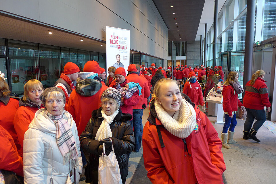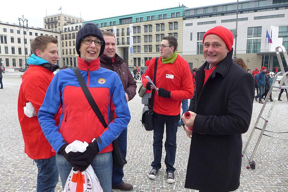 Auf dem Pariser Platz vor dem Brandenburger Tor trafen sich rund 1500 Engagierte der Hilfsorganisation, um ein riesiges rotes Kreuz zu bilden. Zahlreiche Journalisten hielten diese ungewöhnliche Aktion in Bildern fest. Auch Dr. Rudolf Seiters, Präsident des Roten Kreuzes, und der Berliner Innensenator Frank Henkel unterstützten die Aktion vor Ort. Prominente Botschafterinnen wie Jette Joop und Jeanette Biedermann waren ebenfalls mit von der Partie. Ursprünglich sei die Aktion nur auf Rotkreuzler aus Berlin und Brandenburg beschränkt gewesen, so Rolf Zimmermann, der die Eifeler Delegation gemeinsam mit Bianca Züll begleitete. Schließlich aber sei das gesamte Rote Kreuz aufgerufen worden.