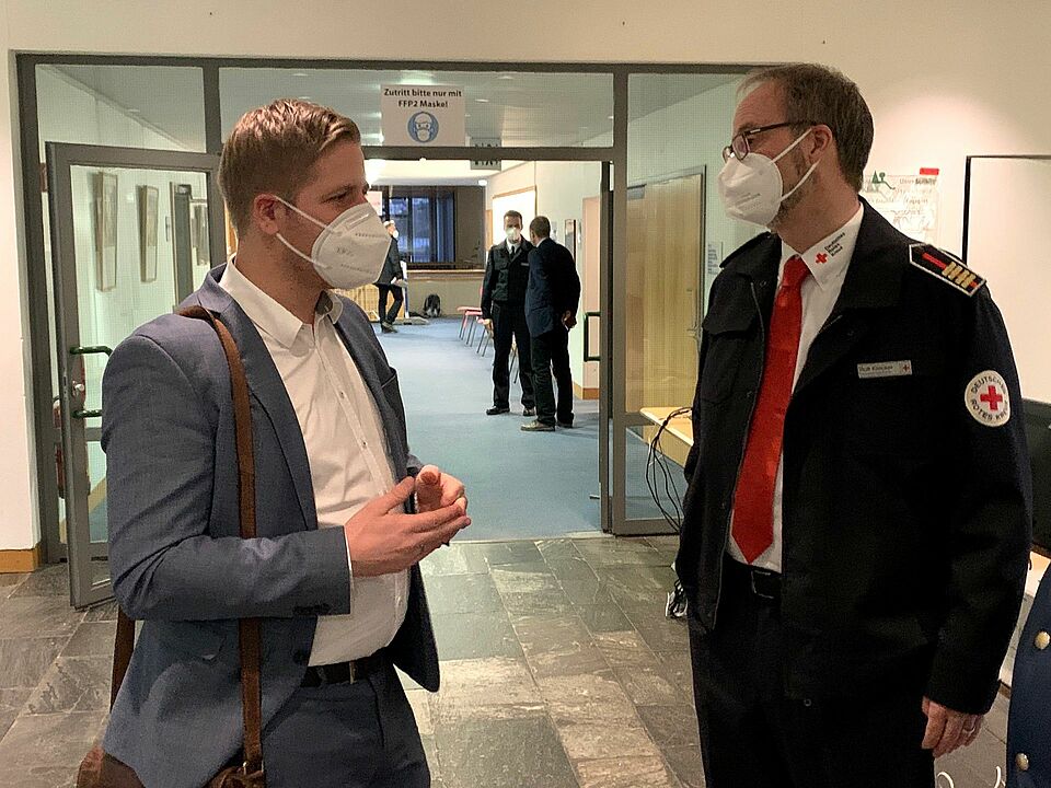 Für die Betreuung nach der Impfung ist das Rote Kreuz im Kreis Euskirchen zuständig. „Dabei geht es einerseits darum, bei medizinischen Notfällen einzugreifen, andererseits aber auch um den Zuspruch und die Beantwortung offener Fragen“, beschreibt es DRK-Kreisgeschäftsführer Rolf Klöcker. „Da Notfälle nicht am Ausgang Halt machen, sind unsere rettungsdienstlich geschulten Kräfte im Falle medizinischer Probleme natürlich auch auf dem gesamten Gelände der Eifelhöhenklinik zur Stelle“, so Klöcker weiter. Neun Rotkreuz-Mitarbeiter sind während der Öffnungszeiten des Impfzentrums für die gesundheitliche und soziale Betreuung der geimpften Personen vor Ort. Auch ein Rettungswagen steht bereit.