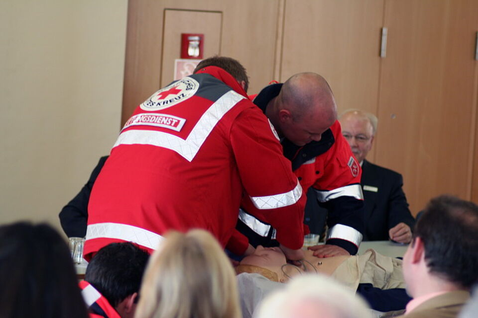 Dr. Gisela Neff, die Leitende Notärztin im Kreis Euskirchen und die Rettungsassistenten Dirk Rose, Henning Hesse und Michael Söte demonstrierten dem rund zweihundertköpfigen Publikum und der geschlossenen Vorstandsmannschaft der Kreissparkasse um Günter Flessau einen Herzinfarkt mit Atemstillstand und Reanimation. Die Zuschauer waren ehrlich beeindruckt. Die Puppe sprach sogar, gab Schmerzgeräusche von sich und reagierte unmittelbar auf die notfallmedizinischen Eingriffe der Rettungskräfte.