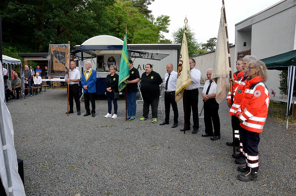 Die Ortsgruppe des DRK Mechernich unter dem Vorsitzenden Sascha Suijkerland wachte über die Veranstaltung und stand auch bei der Fahnenabordnung mit dabei, die aus Vertretern der KG Bleifööss, der Prinzengarde Mechernich und Repräsentanten der alten Mechernicher Bergbautradition bestand. Gewidmet war der Gottesdienst den Lebenden und Verstorbenen der Pfarrgemeinde GdG St. Barbara Mechernich sowie Bergleuten des ehemaligen Bergbaustandortes.