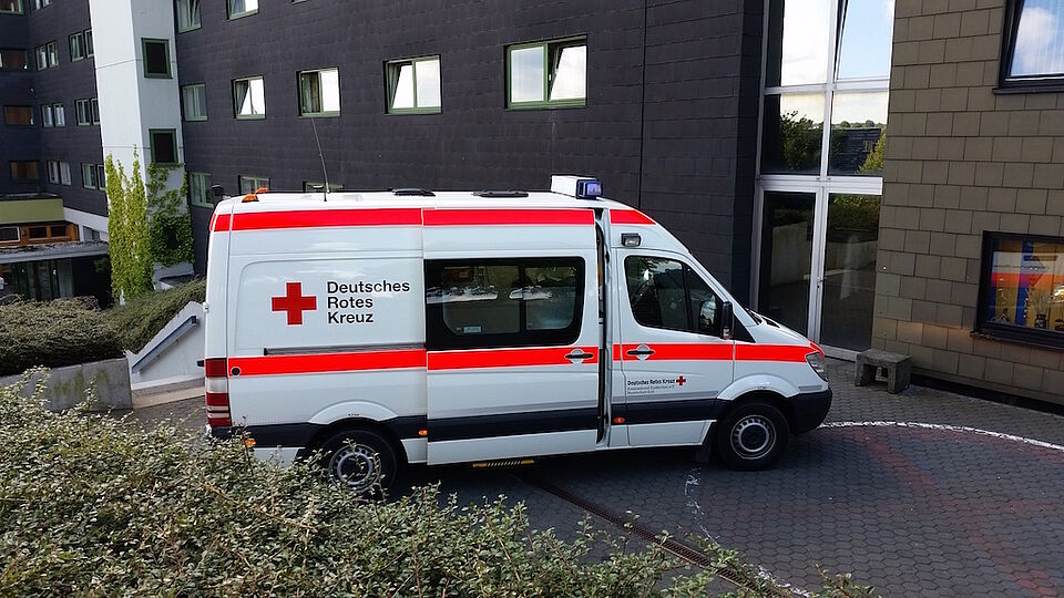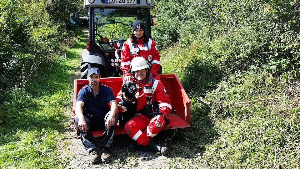 Dann die erlösende Nachricht für Kreisbereitschaftsleiter Jürgen Houbé und Rettungshunde-Einsatzleiterin Julia Tiede: Die dreijährige Labrador-Hündin „Jette“ von Hundeführer Franz Küpper fand den Mann in einem nicht einsehbaren, dichtbewachsenen Steilhang in der Nähe der Klinik. Er war glücklicherweise unversehrt und wurde mit einem Rotkreuz-Rettungswagen, der im Bereitstellungsraum stand, in ein Krankenhaus verlegt.