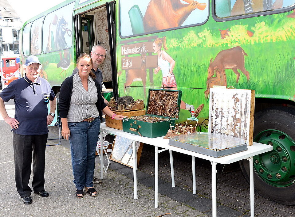 Spektakulär und ästhetisch zugleich präsentierten sich mit blauen Tüchern behangene und wedelnde Stelzenläufer auf dem Brunnenfest. Es waren viele alte Fahrzeuge zu sehen, Traktoren, Autos und Motorräder. Auch der Nationalparkbus „Fagabundus“ war beim 13. Mechernicher Brunnenfest aufgefahren. Organisationsleiter Dirk Gemünd und seine Mannschaft informierten über den Nationalpark Eifel und seinen Förderverein.