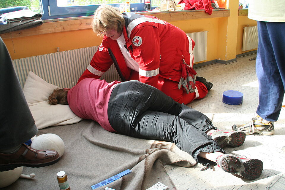 Bild DRK KM | Hier wird eine "Verletzte" in die stabile Seitenlage gelegt. Die stabile Seitenlage ist eine ganz einfache aber lebensrettende Maßnahme, die in jedem Erste Hilfe-Kurs vermittelt wird. Wissen Sie noch, wie es geht?