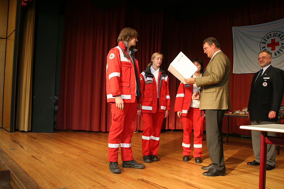 Als erste zeichnete er die Schulsanitätsdienst-Gruppe des Gymnasiums am Turmhof aus: Eine Gruppe aus fünf Schülerinnen und Schülern hatte am Wettbewerb teilgenommen und schloss mit einem sehr guten Ergebnis ab.