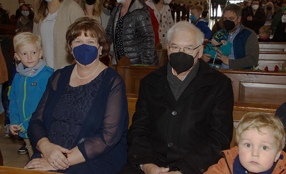 Bei den Fürbitten wurde nicht nur die Kindergartenleiterin und Erzieherin Marlies Lottermoser in den Blick genommen, sondern auch die Frau, Mutter und Oma. Auch Ehemann Helmut, die Söhne Mirco und Marcel, Schwiegertöchter und Enkelkinder waren sowohl in der Kirche als auch beim anschließenden Empfang im Johanneshaus mit von der Partie.