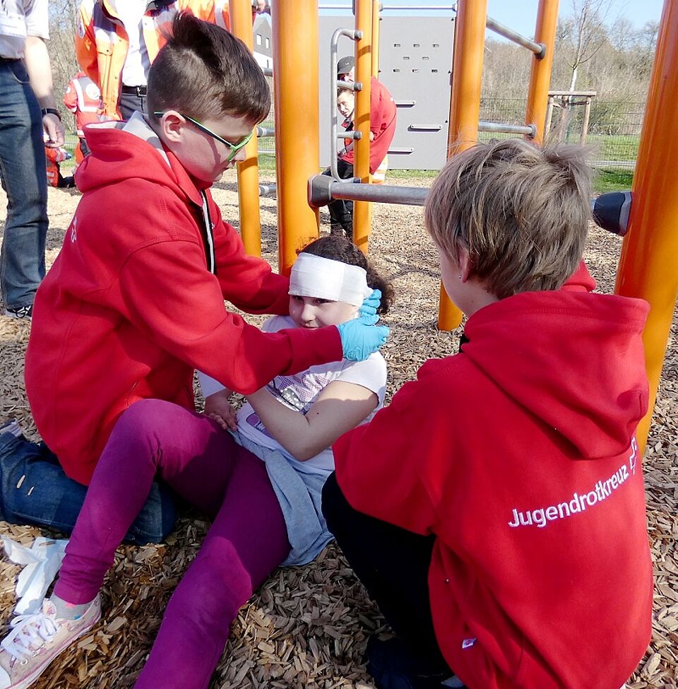 Die zweite Wettbewerbsstation befand sich direkt vor dem Rathaus, dazu hatte der Abschlepp- und Bergedienst Pokraka aus Mechernich zwei Unfallfahrzeuge zur Verfügung gestellt, mit denen ein Verkehrsunfall mit mehreren Verletzten simuliert wurde. Hier mussten die Wettbewerbsteilnehmer nicht nur die Verletzten versorgen und gegebenenfalls auch aus dem Fahrzeug bergen, sondern auch noch an den von ihnen selbst gerufenen Rettungsdienst übergeben. Einigen Teilnehmern war die ungewohnte Situation deutlich anzumerken. Übungen unter derart realistischen Bedingungen gehören nun mal nicht zum Alltag. Zwei weitere Szenarien befanden sich an der Dialysestation und am neuen Mehrgenerationen-Abenteuerspielplatz. An beiden Stationen galt es verschiedene Aufgaben zu bewältigen, Gefahren zu erkennen und Entscheidungen zu treffen. Eins hatten jedoch alle Aufgaben gemeinsam: Im Vordergrund stand nicht die Leistung eines Einzelnen, sondern die des gesamten Teams, denn nur gemeinsam waren die Aufgaben zu meistern.