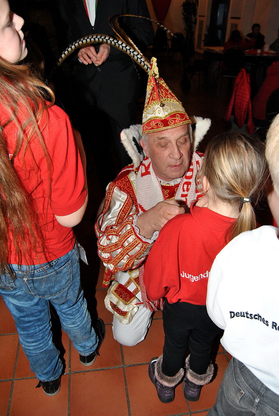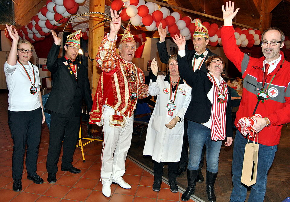 Mit Präsenten und einem Schal des Roten Kreuzes, der farblich perfekt zum Ornat des Prinzen passte, bedankte sich Klöcker für den Einsatz. Zuvor hatte Prinz Rolf III. die Verantwortlichen des Roten Kreuzes und des Blutspendedienstes mit Sessionsorden dekoriert. Dabei vergaß er auch nicht den DRK-Nachwuchs. Den fünf Kindern aus der Gruppe von Betreuerin Nicole Thielen steckte er als Anerkennung für ihre Mithilfe kleine Orden an. Die Fünf- bis Zehnjährigen halfen beispielsweise mit Feuereifer beim Aufräumen und versorgten die Spender mit Getränken. Außerdem waren acht weitere ehrenamtliche Helfer des DRK-Ortsvereins stundenlang im Einsatz, damit sich die Blutspender am leckeren Büfett mit kalten und warmen Speisen stärken konnten.